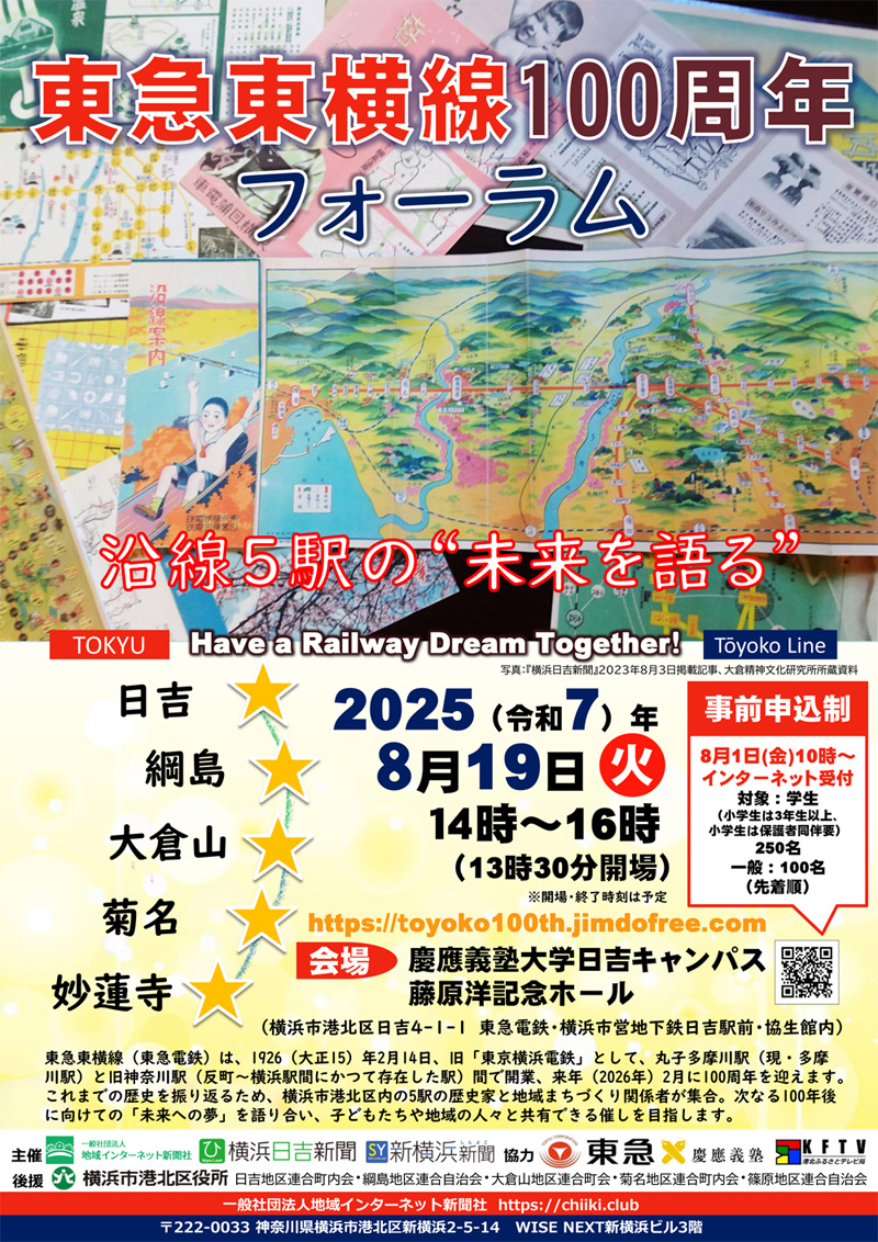 一般社団法人地域インターネット新聞社(横浜市港北区)は、「東急東横線100周年フォーラム~沿線5駅の“未来を語る”」を、今週(2025年)8月19日(火)14時から16時30分まで、慶應義塾大学日吉キャンパス内協生館「藤原洋記念ホール」(日吉4)で開催しました。